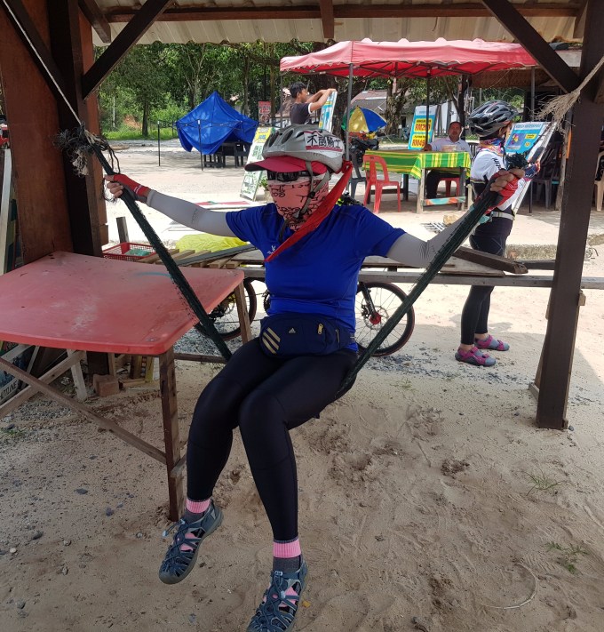 Before I share our rides of this beautiful island, Langkawi, please allow the beautiful Weay Weay to show you the proper wear of how to avoid ultra violet and sun burn when pedalling in tropical island in hot sun. Please refer to the photo at left. You have to cover yourself from top to toe, with a long beak cap and large sun glasses to protect your face. Arm sleeves and hand gloves is a must, bandanna to cover your neck. Try your best to cover almost every inch of your body until even your friend can’t recognise who you are, like the girl…(err…or man?…) in the photo, than you are safe to start your ride. (Only joking.)