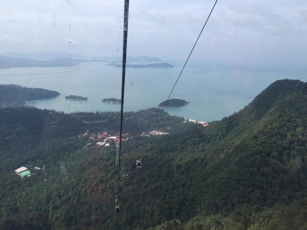 浮罗交怡不止有海,沙滩,还有高山,青山,雨林。。。还有世界级的两个建设就在据说有五亿年的热带雨林里 (其实整个世界都是几亿年的产物啦,就是你家客厅瓷砖下的泥土也是上亿年的东西,人其实就活在历史中)。言归真传,浮罗交怡世界级的两大建设,其一就是一座很著名的浮桥––天空之桥,另一个是世界最先进的缆车系统。(我没有天空之桥的照片,限于版权,不可从网上下截,请自行上网查阅)。天空之桥著名在于只依靠一根柱子作为支点,横跨两座山峰的设计。在桥中心大力跳时还可感觉桥的摇晃,想要体验在死亡边缘的感受,可在桥上尽情的跳。 乘世界上最先进的缆车上山看桥,缆车票加过桥费,每人最低消费要五十大洋马币。桥上的观景台有360度的视野,可欣赏到分佈在浮罗交怡四周的小岛和马六甲海峡。假如天气晴朗,无云无雨,无雾无烟霾,还可看到邻国。